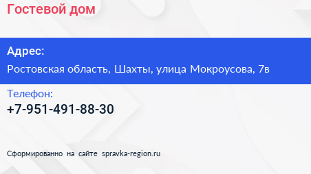 Гостевой дом по адресу Ростовская область, Шахты, улица Мокроусова, 7в в дальнейшем Организация, размещена в следующих категориях: