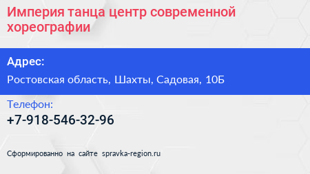Империя танца, центр современной хореографии по адресу Ростовская область, Шахты, Садовая, 10Б в дальнейшем Организация, размещена в следующих категориях: