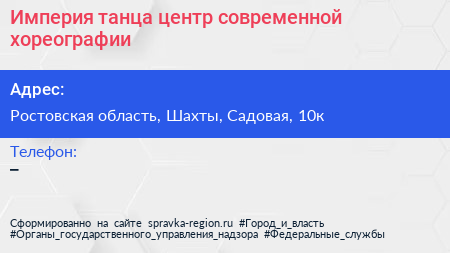 Империя танца, центр современной хореографии по адресу Ростовская область, Шахты, Садовая, 10к в дальнейшем Организация, размещена в следующих категориях: