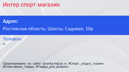 Интер спорт, магазин по адресу Ростовская область, Шахты, Садовая, 10р в дальнейшем Организация, размещена в следующих категориях: