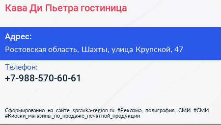 Кава Ди Пьетра, гостиница по адресу Ростовская область, Шахты, улица Крупской, 47 в дальнейшем Организация, размещена в следующих категориях:
