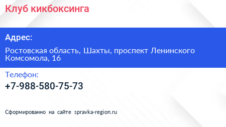 Клуб кикбоксинга по адресу Ростовская область, Шахты, проспект Ленинского Комсомола, 16 в дальнейшем Организация, размещена в следующих категориях: