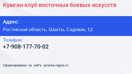 Кумган, клуб восточных боевых искусств по адресу Ростовская область, Шахты, Садовая, 12 в дальнейшем Организация, размещена в следующих категориях:
