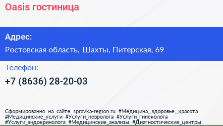 Oasis, гостиница по адресу Ростовская область, Шахты, Питерская, 69 в дальнейшем Организация, размещена в следующих категориях: