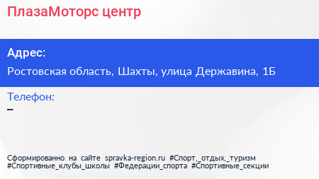 ПлазаМоторс, центр по адресу Ростовская область, Шахты, улица Державина, 1Б в дальнейшем Организация, размещена в следующих категориях:
