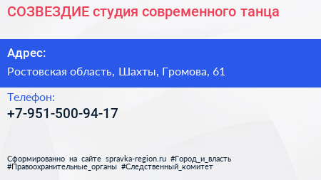 СОЗВЕЗДИЕ, студия современного танца по адресу Ростовская область, Шахты, Громова, 61 в дальнейшем Организация, размещена в следующих категориях: