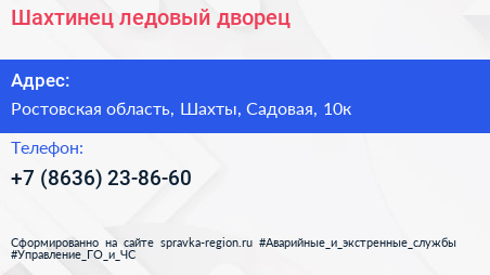 Шахтинец, ледовый дворец по адресу Ростовская область, Шахты, Садовая, 10к в дальнейшем Организация, размещена в следующих категориях: