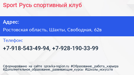 Sport Русь, спортивный клуб по адресу Ростовская область, Шахты, Свободная, 62в в дальнейшем Организация, размещена в следующих категориях: