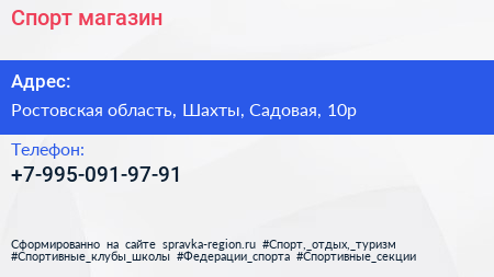 Спорт, магазин по адресу Ростовская область, Шахты, Садовая, 10р в дальнейшем Организация, размещена в следующих категориях: