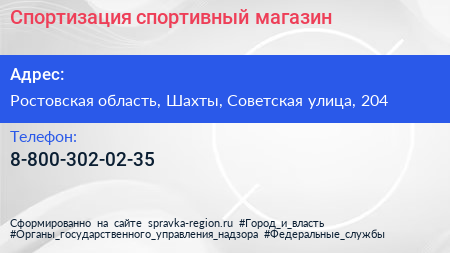 Спортизация, спортивный магазин по адресу Ростовская область, Шахты, Советская улица, 204 в дальнейшем Организация, размещена в следующих категориях: