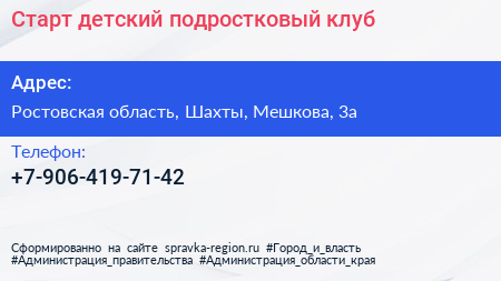 Старт, детский подростковый клуб по адресу Ростовская область, Шахты, Мешкова, 3а в дальнейшем Организация, размещена в следующих категориях: