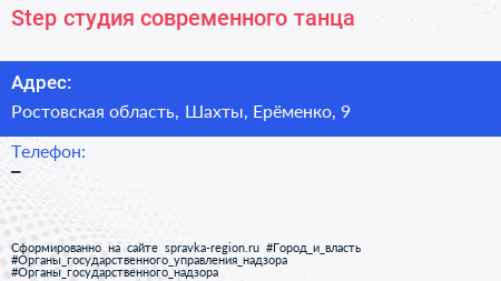 Step, студия современного танца по адресу Ростовская область, Шахты, Ерёменко, 9 в дальнейшем Организация, размещена в следующих категориях: