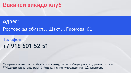 Вакикай, айкидо-клуб по адресу Ростовская область, Шахты, Громова, 61 в дальнейшем Организация, размещена в следующих категориях: