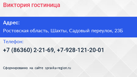 Виктория, гостиница по адресу Ростовская область, Шахты, Садовый переулок, 23Б в дальнейшем Организация, размещена в следующих категориях: