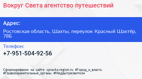Вокруг Света, агентство путешествий по адресу Ростовская область, Шахты, переулок Красный Шахтёр, 78Б в дальнейшем Организация, размещена в следующих категориях: