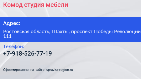 Комод, студия мебели по адресу Ростовская область, Шахты, проспект Победы Революции, 111 в дальнейшем Организация, размещена в следующих категориях: