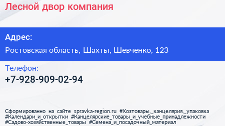 Лесной двор, компания по адресу Ростовская область, Шахты, Шевченко, 123 в дальнейшем Организация, размещена в следующих категориях: