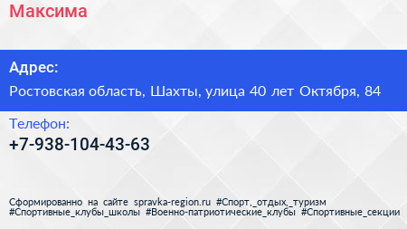 Максима по адресу Ростовская область, Шахты, улица 40 лет Октября, 84 в дальнейшем Организация, размещена в следующих категориях: