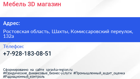 Мебель 3D, магазин по адресу Ростовская область, Шахты, Комиссаровский переулок, 132а в дальнейшем Организация, размещена в следующих категориях: