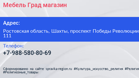 Мебель Град, магазин по адресу Ростовская область, Шахты, проспект Победы Революции, 111 в дальнейшем Организация, размещена в следующих категориях: