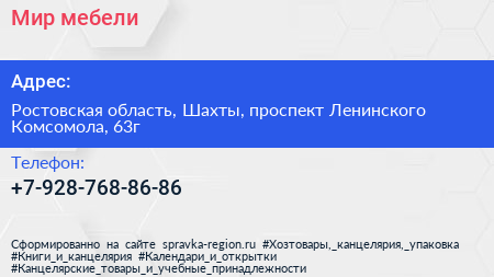 Мир мебели по адресу Ростовская область, Шахты, проспект Ленинского Комсомола, 63г в дальнейшем Организация, размещена в следующих категориях: