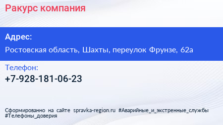 Ракурс, компания по адресу Ростовская область, Шахты, переулок Фрунзе, 62а в дальнейшем Организация, размещена в следующих категориях: