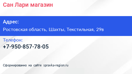 Сан Лари, магазин по адресу Ростовская область, Шахты, Текстильная, 29в в дальнейшем Организация, размещена в следующих категориях: