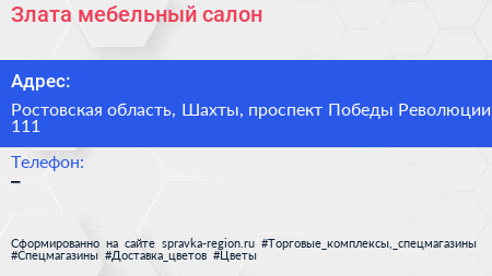 Злата, мебельный салон по адресу Ростовская область, Шахты, проспект Победы Революции, 111 в дальнейшем Организация, размещена в следующих категориях: