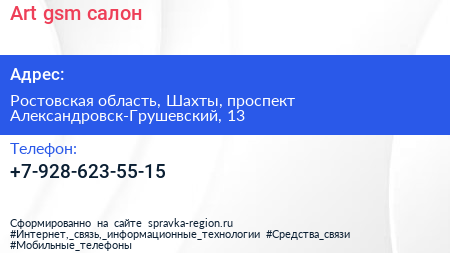 Art-gsm, салон по адресу Ростовская область, Шахты, проспект Александровск-Грушевский, 13 в дальнейшем Организация, размещена в следующих категориях: