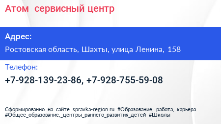 Атом+, сервисный центр по адресу Ростовская область, Шахты, улица Ленина, 158 в дальнейшем Организация, размещена в следующих категориях: