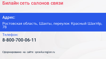 Билайн, сеть салонов связи по адресу Ростовская область, Шахты, переулок Красный Шахтёр, 78 в дальнейшем Организация, размещена в следующих категориях: