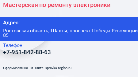 Мастерская по ремонту электроники по адресу Ростовская область, Шахты, проспект Победы Революции, 85 в дальнейшем Организация, размещена в следующих категориях: