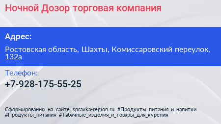 Ночной Дозор, торговая компания по адресу Ростовская область, Шахты, Комиссаровский переулок, 132а в дальнейшем Организация, размещена в следующих категориях: