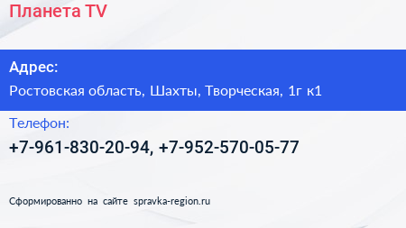 Планета TV по адресу Ростовская область, Шахты, Творческая, 1г к1 в дальнейшем Организация, размещена в следующих категориях:
