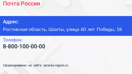 Почта России по адресу Ростовская область, Шахты, улица 60 лет Победы, 18 в дальнейшем Организация, размещена в следующих категориях: