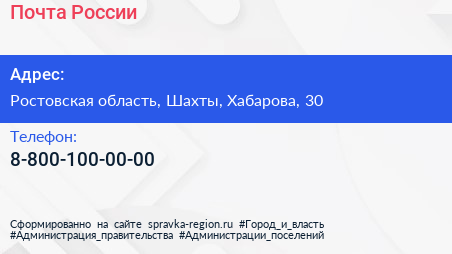 Почта России по адресу Ростовская область, Шахты, Хабарова, 30 в дальнейшем Организация, размещена в следующих категориях: