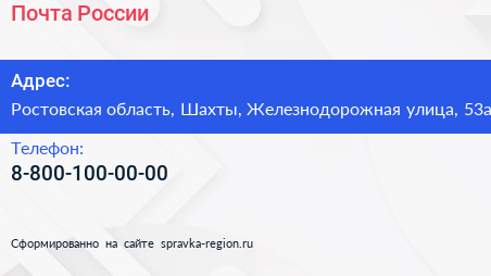 Почта России по адресу Ростовская область, Шахты, Железнодорожная улица, 53а в дальнейшем Организация, размещена в следующих категориях:
