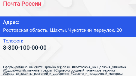 Почта России по адресу Ростовская область, Шахты, Чукотский переулок, 20 в дальнейшем Организация, размещена в следующих категориях: