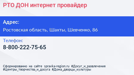 РТО-ДОН, интернет-провайдер по адресу Ростовская область, Шахты, Шевченко, 86 в дальнейшем Организация, размещена в следующих категориях: