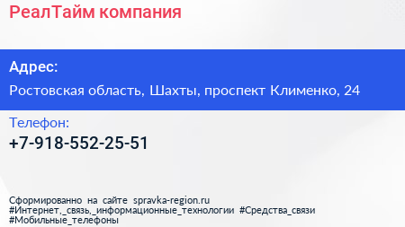 РеалТайм, компания по адресу Ростовская область, Шахты, проспект Клименко, 24 в дальнейшем Организация, размещена в следующих категориях: