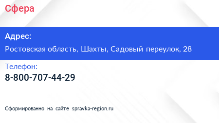 Сфера по адресу Ростовская область, Шахты, Садовый переулок, 28 в дальнейшем Организация, размещена в следующих категориях: