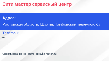 Сити мастер, сервисный центр по адресу Ростовская область, Шахты, Тамбовский переулок, 6а в дальнейшем Организация, размещена в следующих категориях:
