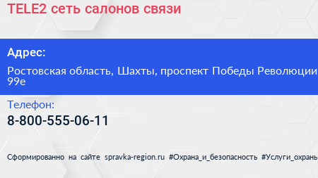 TELE2, сеть салонов связи по адресу Ростовская область, Шахты, проспект Победы Революции, 99е в дальнейшем Организация, размещена в следующих категориях: