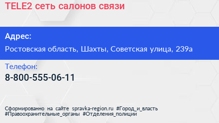 TELE2, сеть салонов связи по адресу Ростовская область, Шахты, Советская улица, 239а в дальнейшем Организация, размещена в следующих категориях: