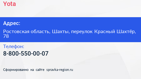 Yota по адресу Ростовская область, Шахты, переулок Красный Шахтёр, 78 в дальнейшем Организация, размещена в следующих категориях: