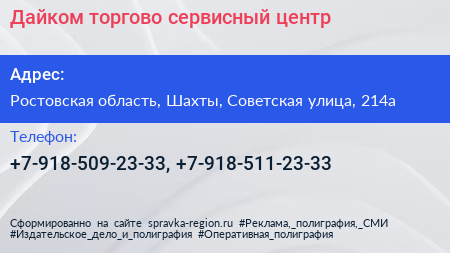 Дайком, торгово-сервисный центр по адресу Ростовская область, Шахты, Советская улица, 214а в дальнейшем Организация, размещена в следующих категориях: