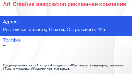 Art Creative association, рекламная компания по адресу Ростовская область, Шахты, Островского, 42а в дальнейшем Организация, размещена в следующих категориях: