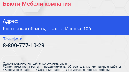 Бьюти Мебели, компания по адресу Ростовская область, Шахты, Ионова, 106 в дальнейшем Организация, размещена в следующих категориях: