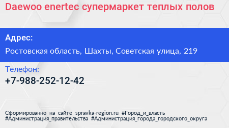 Daewoo enertec, супермаркет теплых полов по адресу Ростовская область, Шахты, Советская улица, 219 в дальнейшем Организация, размещена в следующих категориях:
