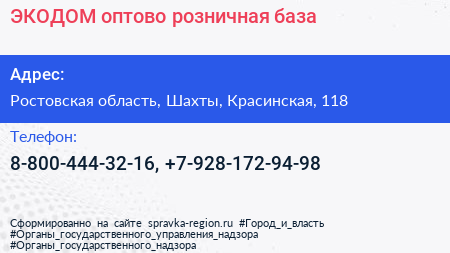 ЭКОДОМ, оптово-розничная база по адресу Ростовская область, Шахты, Красинская, 118 в дальнейшем Организация, размещена в следующих категориях: